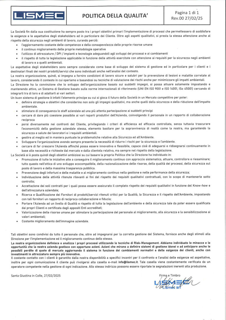 Lismec aderisce ai principi “UN Global Compact Principles” sulla base di dichiarazioni e convenzioni adottate a livello internazionale nelle 4 aree seguenti: